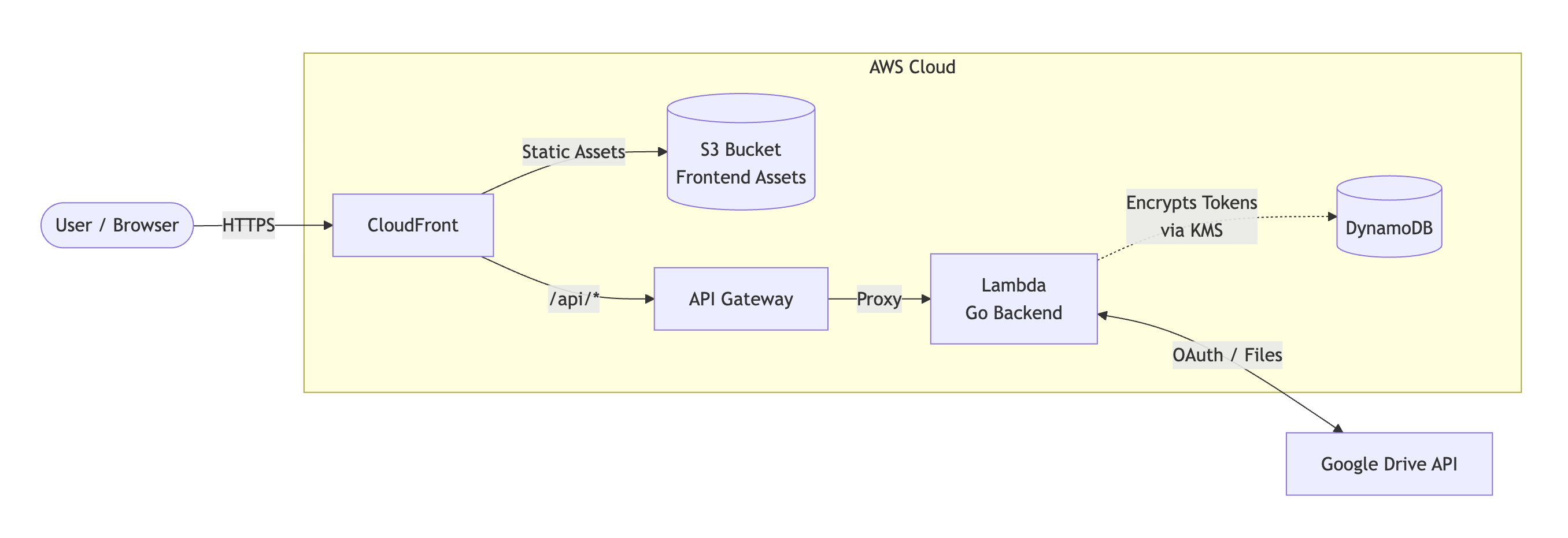 データはすべてGoogle Driveに保存するが、リフレッシュトークンの管理のためにDynamoDBを置いている。またDemo Modeとしてログイン不要で使えるモードを用意していて、これのデータもDynamoDBに置いている(デモなので60分で消滅するようTTL設定している)。